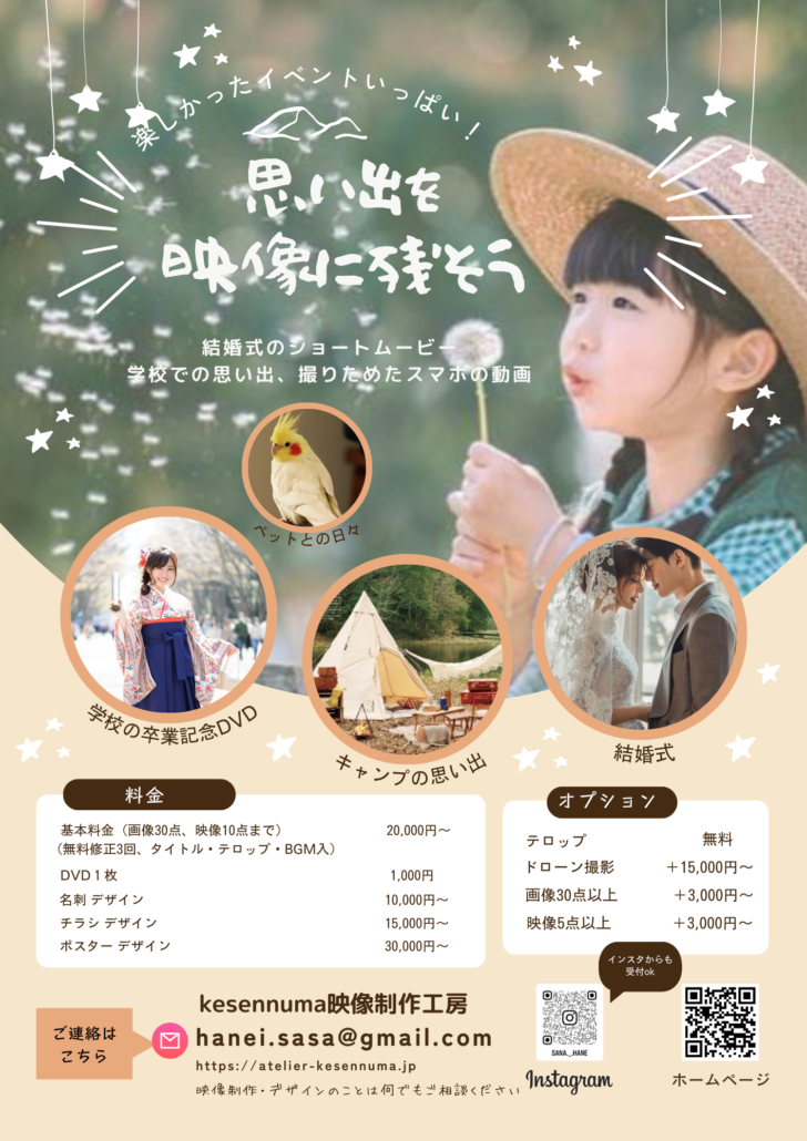結婚式、撮り溜めた家族の映像整理、同窓会、卒業記念DVD作成、故人様の追悼映像制作など、なんでもご相談ください。